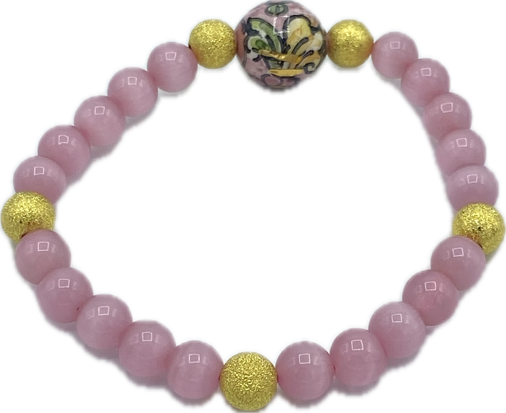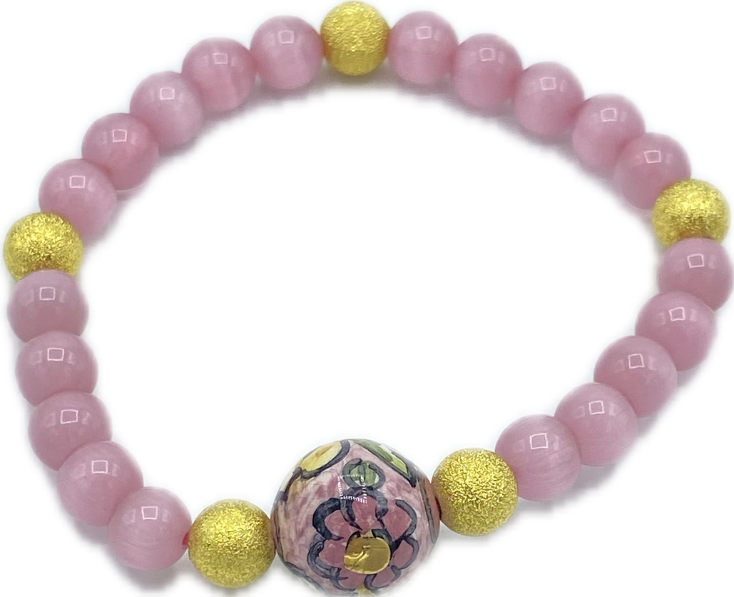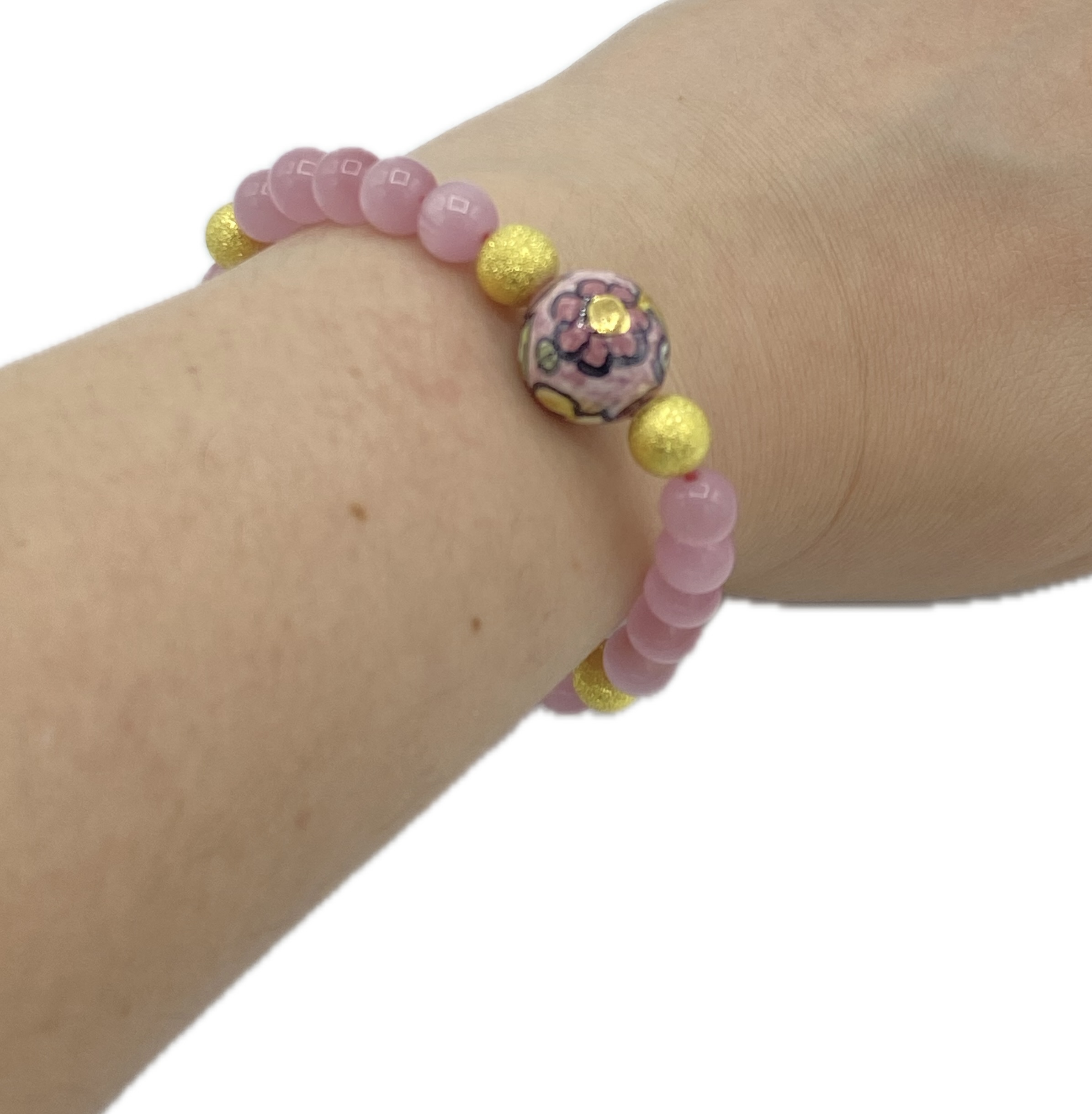 Composto da pietre dure in occhio di gatto rosa, questo bracciale è impreziosito da una perla in ceramica modellata e dipinta a mano, rifinita con eleganti tocchi in lustro in oro, e da bussolotti in ottone lucente ✨