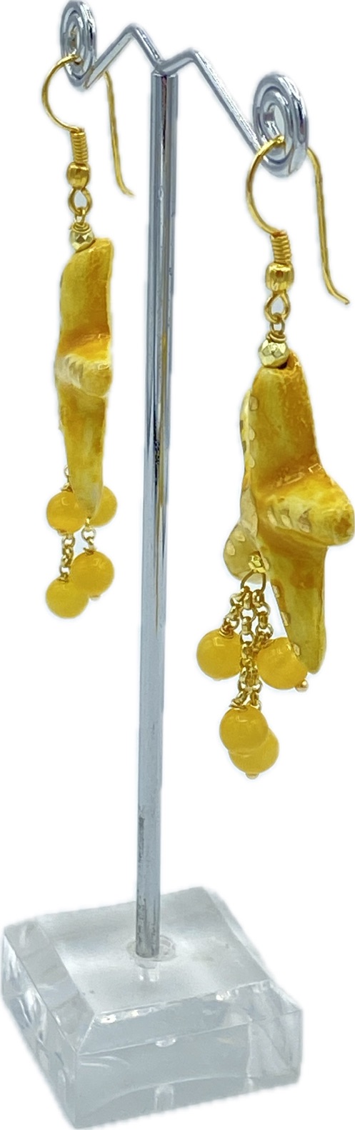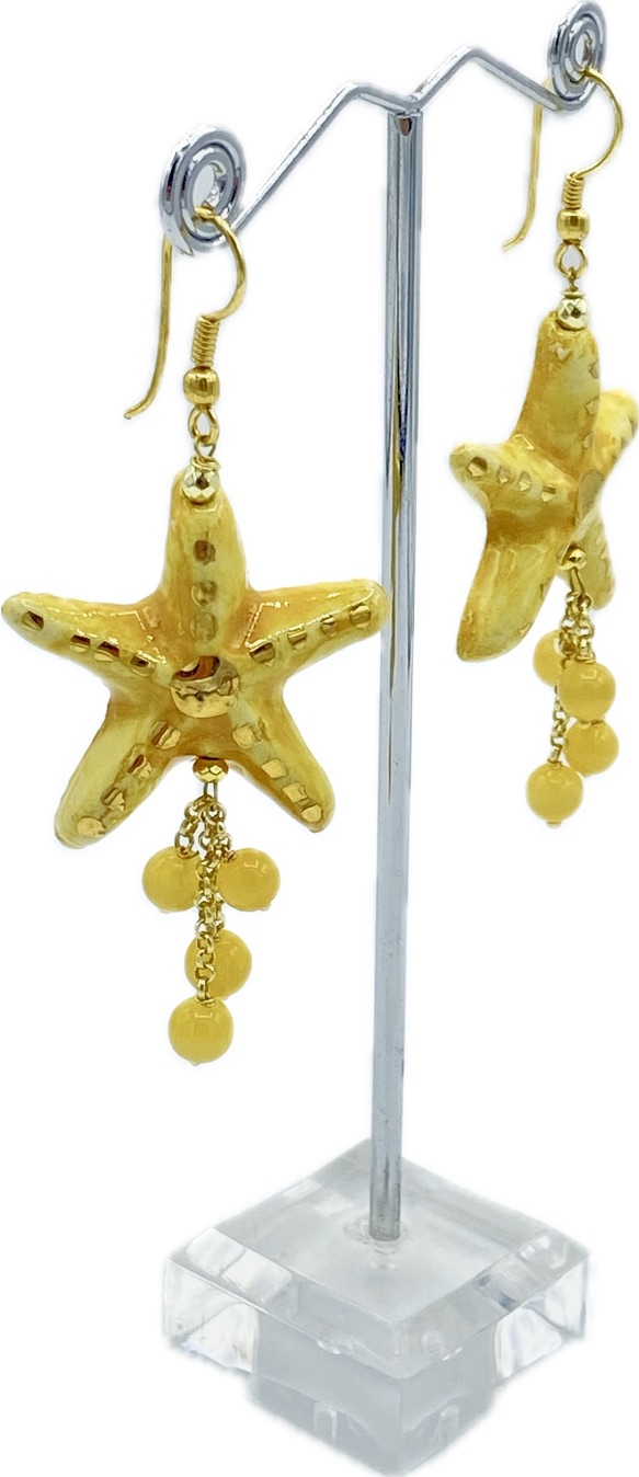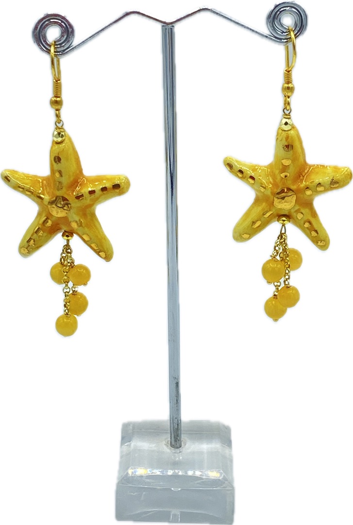 Questa coppia di orecchini raffigura due stelle marine modellate e dipinte interamente a mano, impreziosite da eleganti dettagli in lustro oro che donano un tocco luminoso e raffinato alla ceramica.