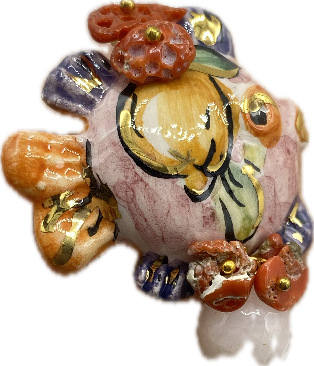 - Pesce in Ceramica con Lustro in Oro: Un pesce in ceramica, decorato con lustro in oro, che aggiunge un elemento distintivo e un tocco di lusso al design.