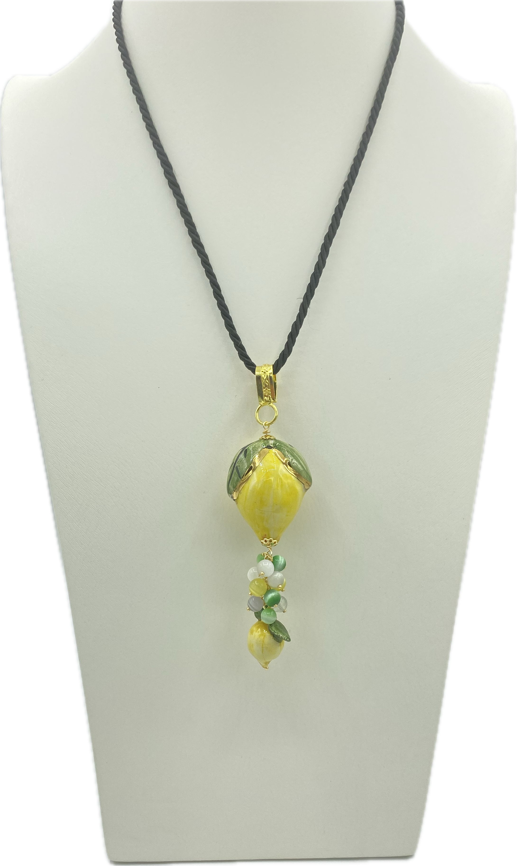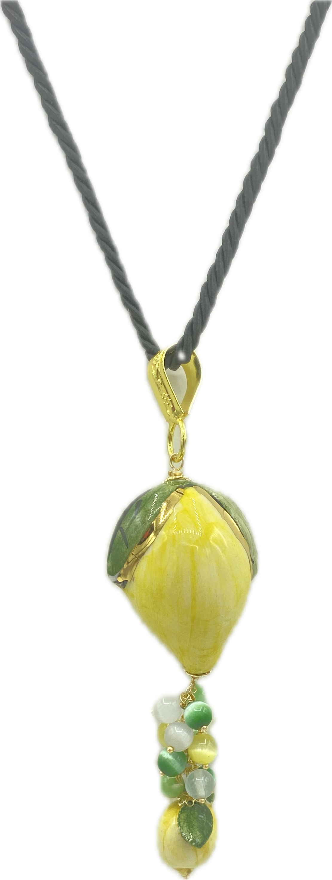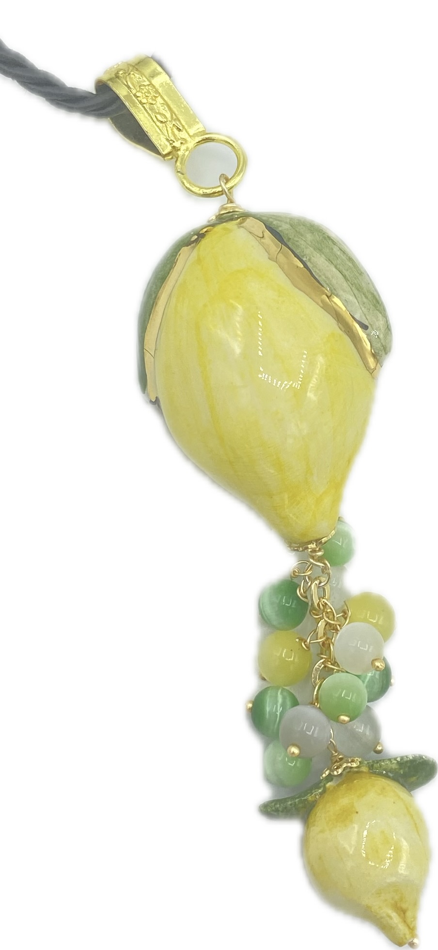 Ciondolo realizzato interamente a mano, modellato e dipinto con cura per raffigurare un colorato limone in ceramica, impreziosito da eleganti decorazioni in lustro in oro.