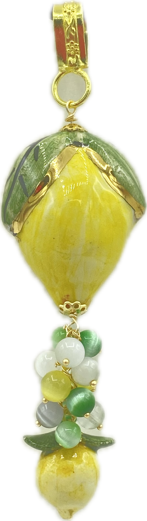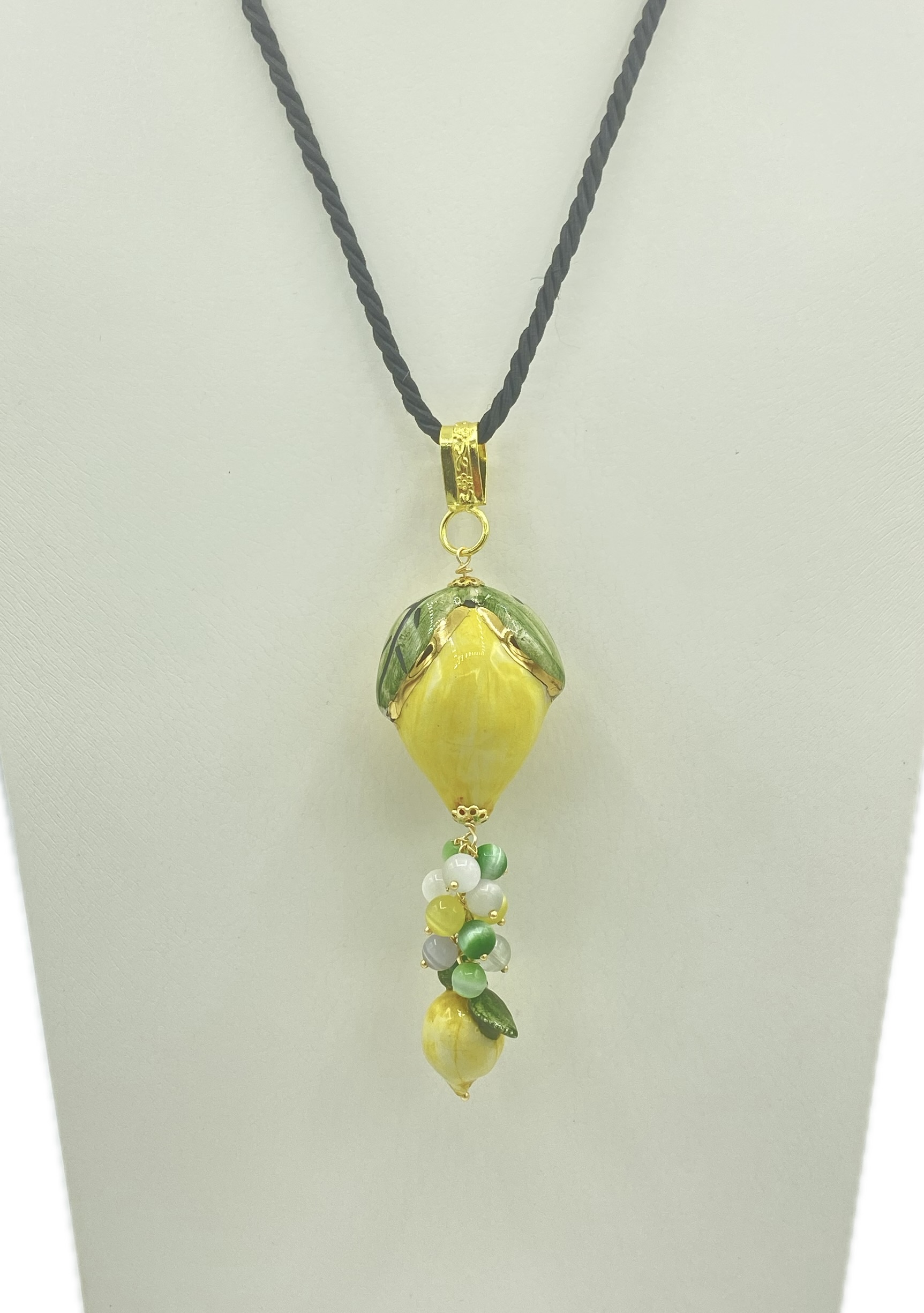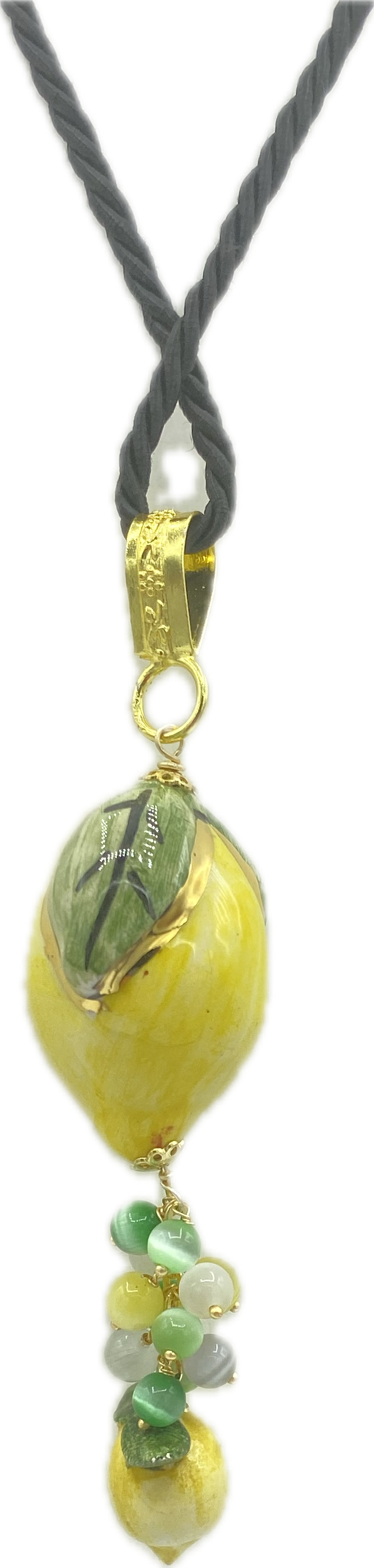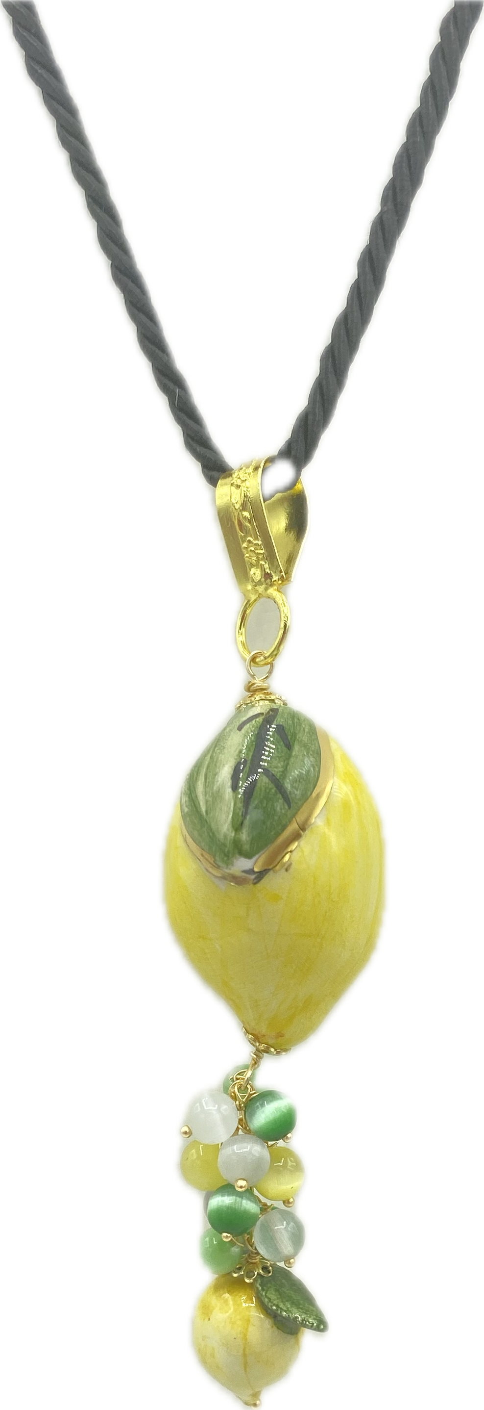 Ciondolo realizzato interamente a mano, modellato e dipinto con cura per raffigurare un colorato limone in ceramica, impreziosito da eleganti decorazioni in lustro in oro.