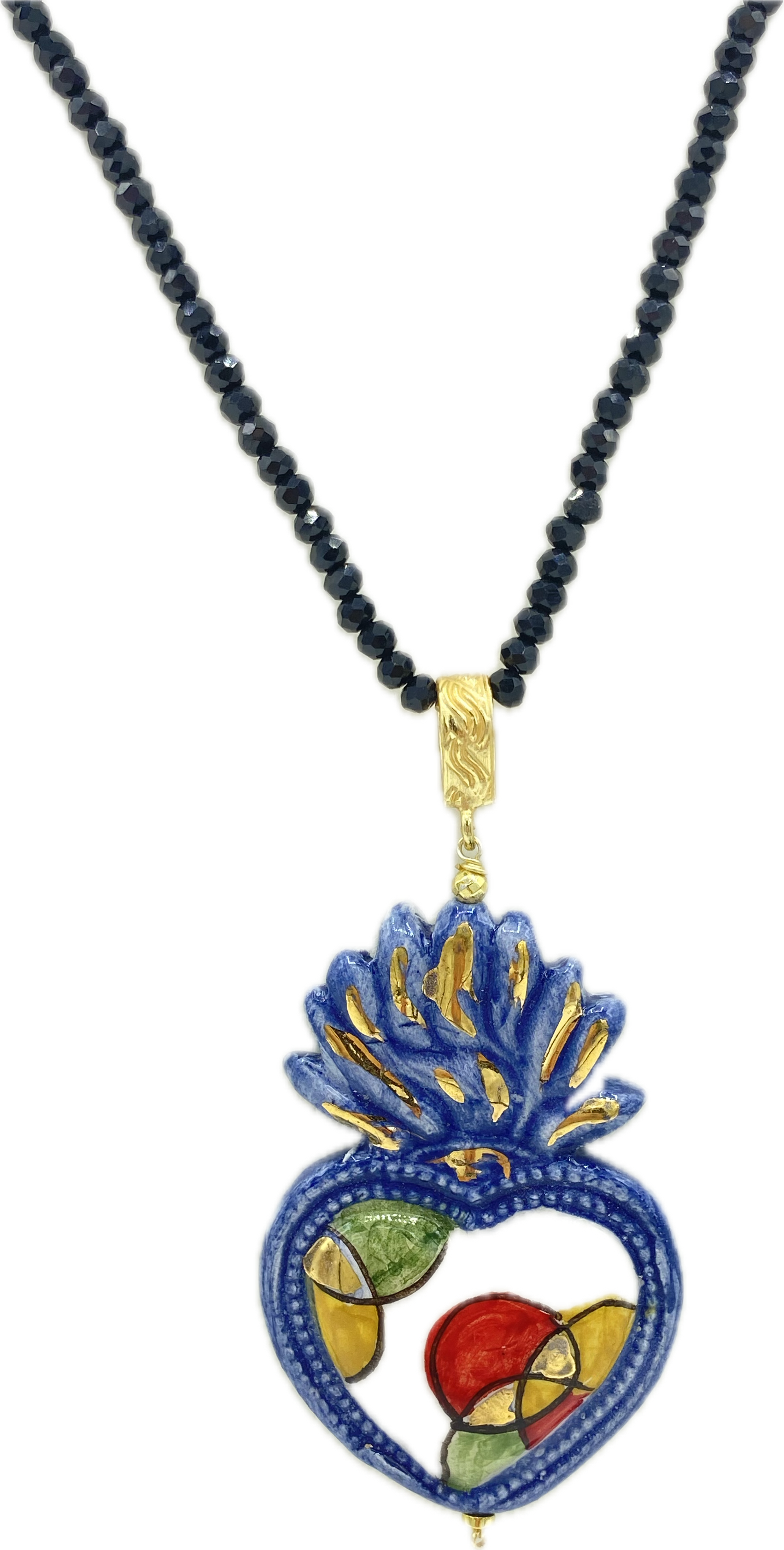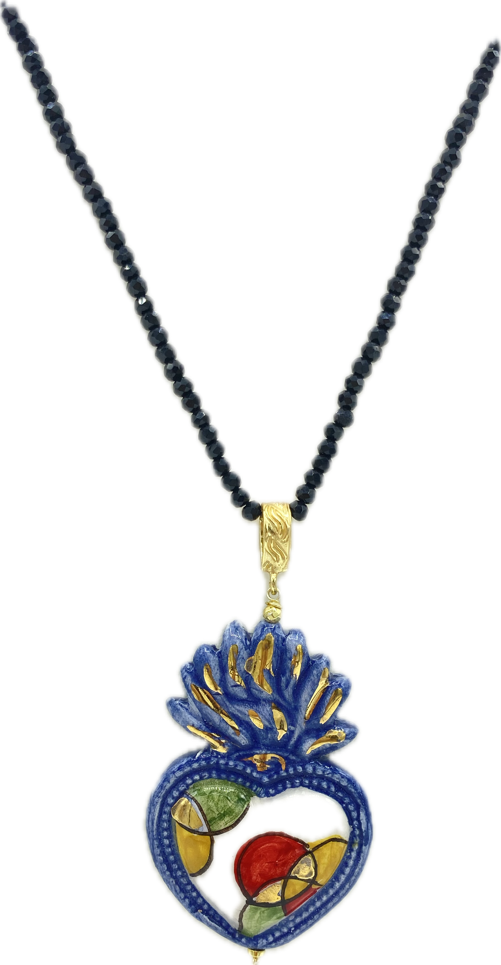 Scopri l’incanto del nostro Ciondolo Cuore Sacro Ex Voto in ceramica blu, dipinto a mano con dettagli in lustro in oro.