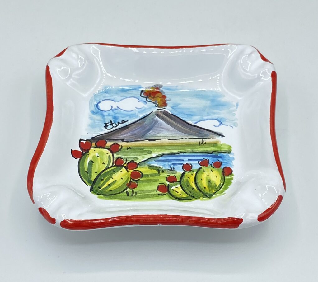 Elegante posacenere in ceramica dipinto a mano, raffigura un paesaggio tipico siciliano, con l’Etna e i caratteristici fichi d’India.