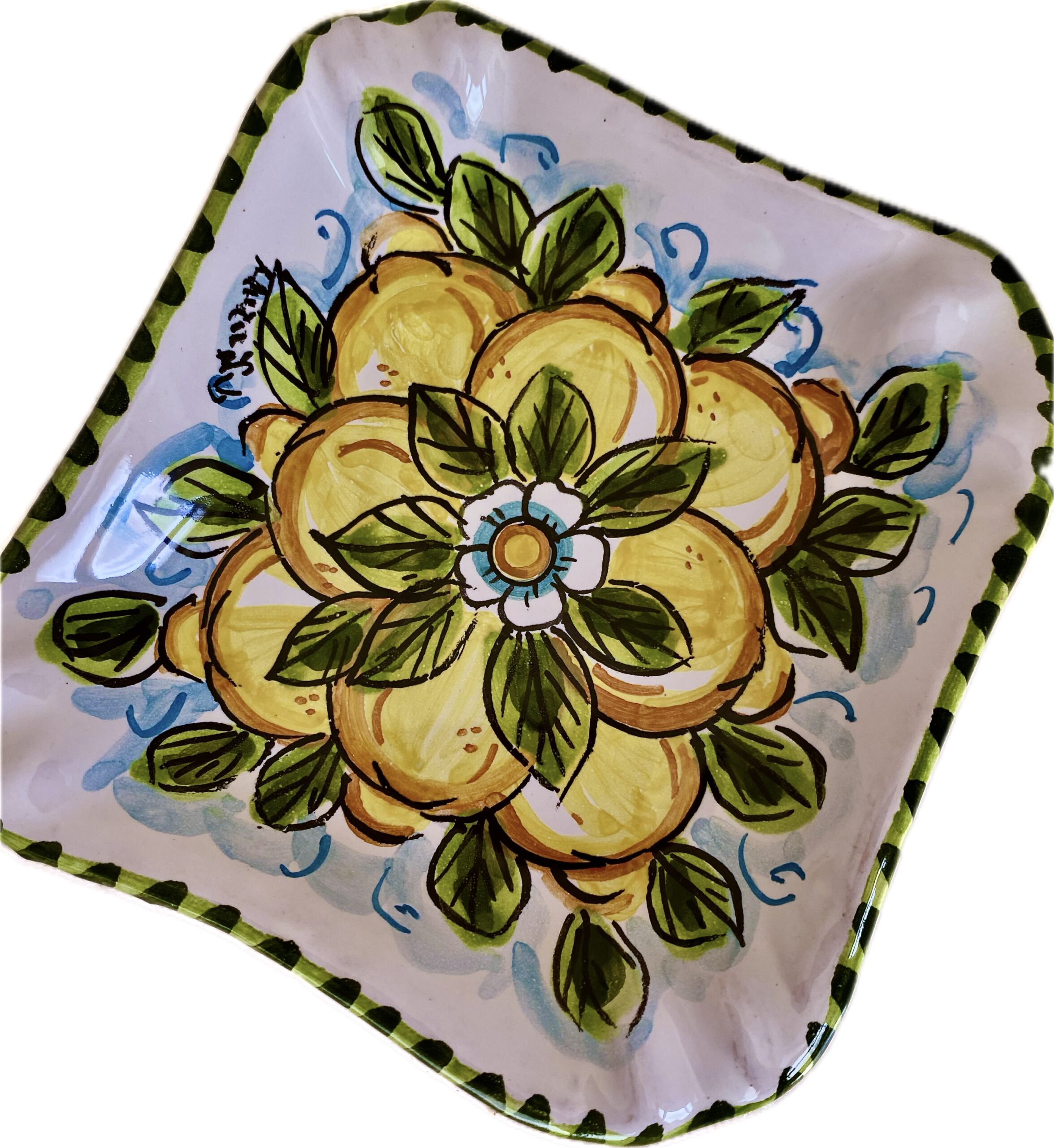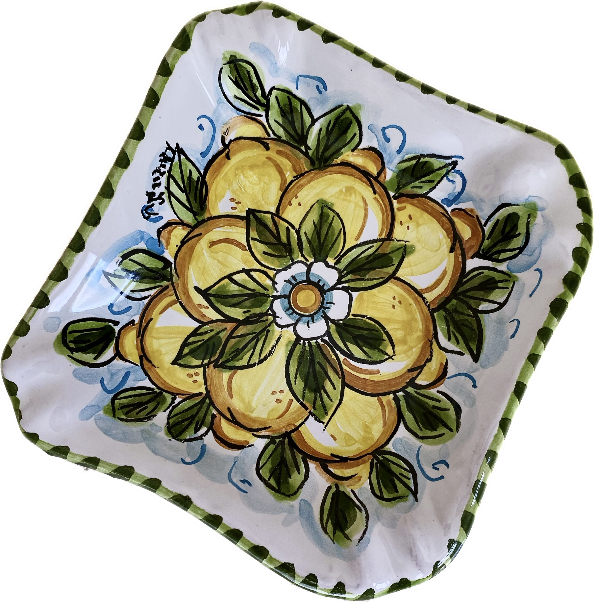 Elegante posacenere in ceramica, dipinto a mano con vivaci limoni e un delicato fiore centrale, porta un tocco di colore e tradizione siciliana in ogni ambiente.