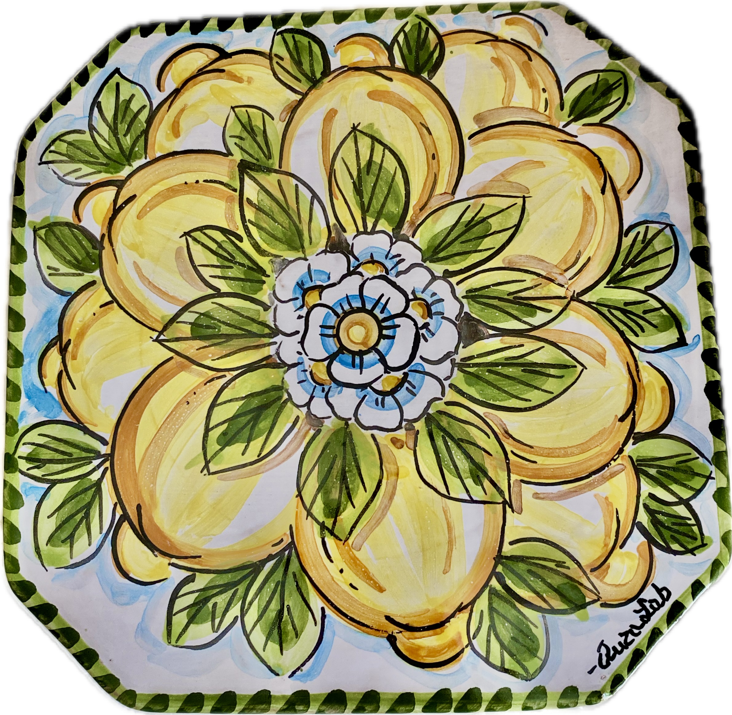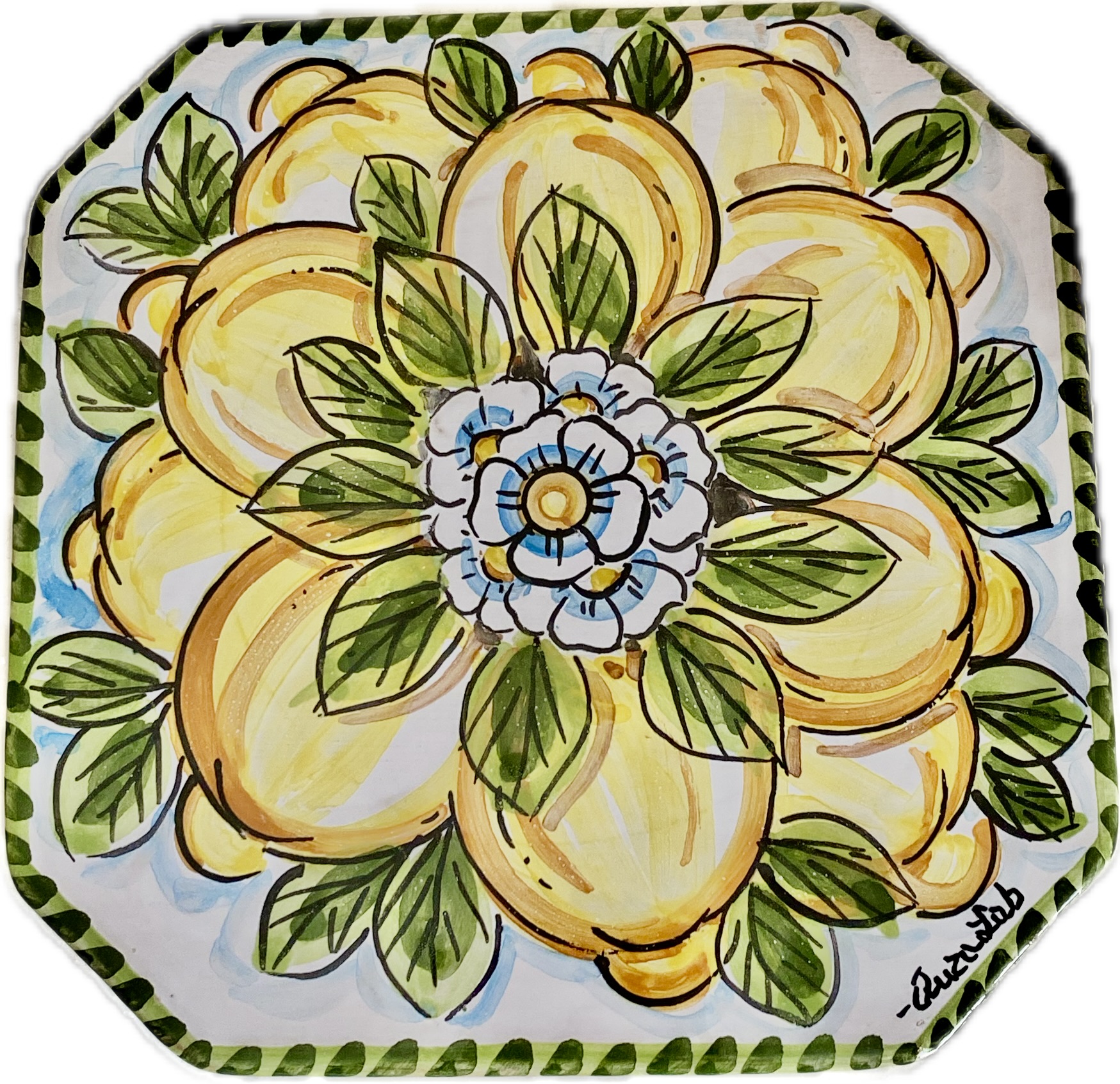 Splendido sotto pentola ottagonale in ceramica dipinto a mano con dettagli vivaci, raffiguranti limoni e un elegante fiore centrale. Realizzato con cura artigianale, è perfetto per proteggere le superfici dal calore e aggiungere un tocco di colore e tradizione alla tua cucina.