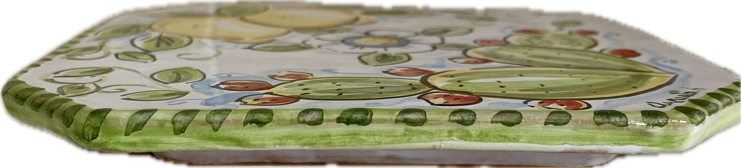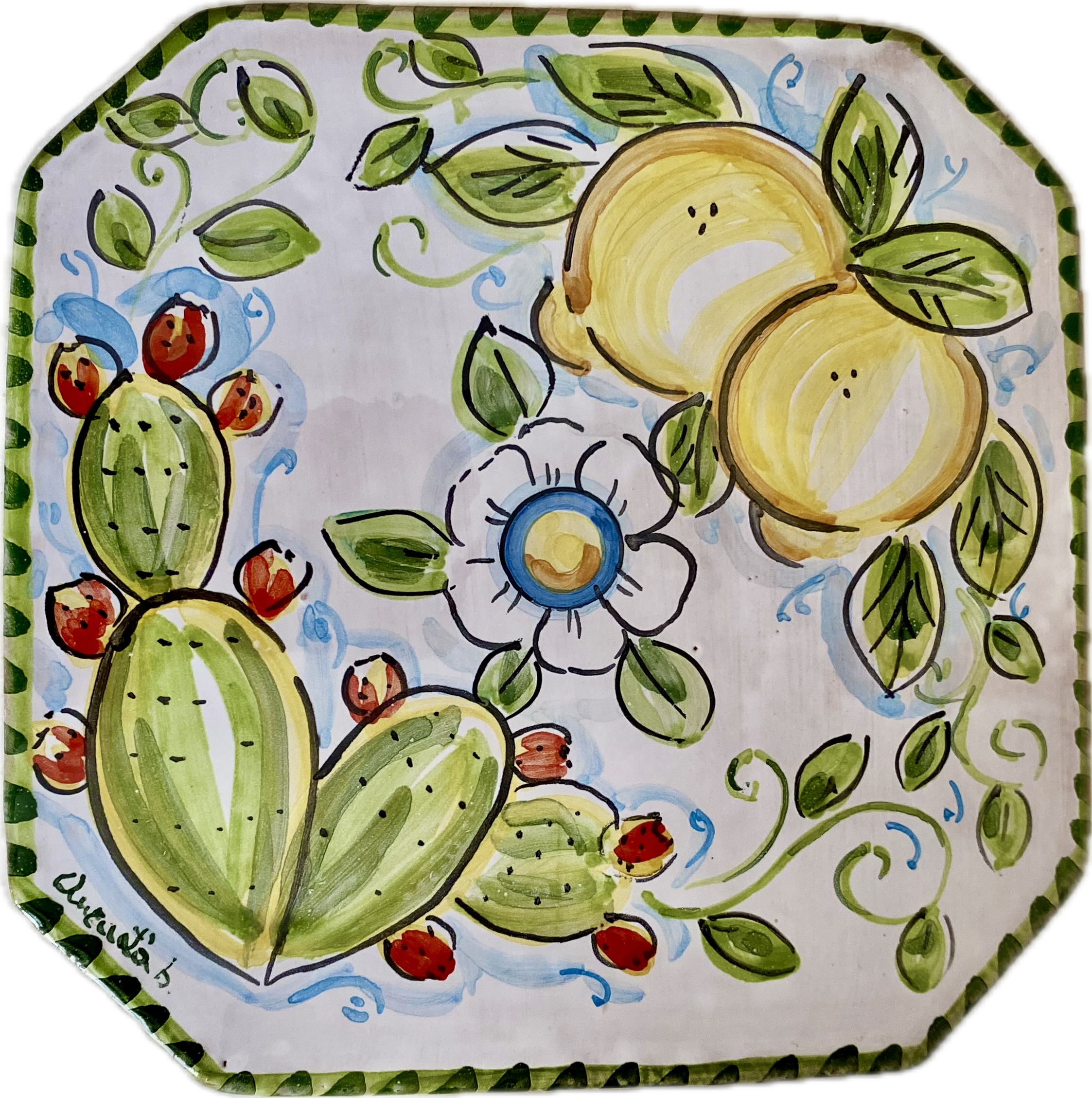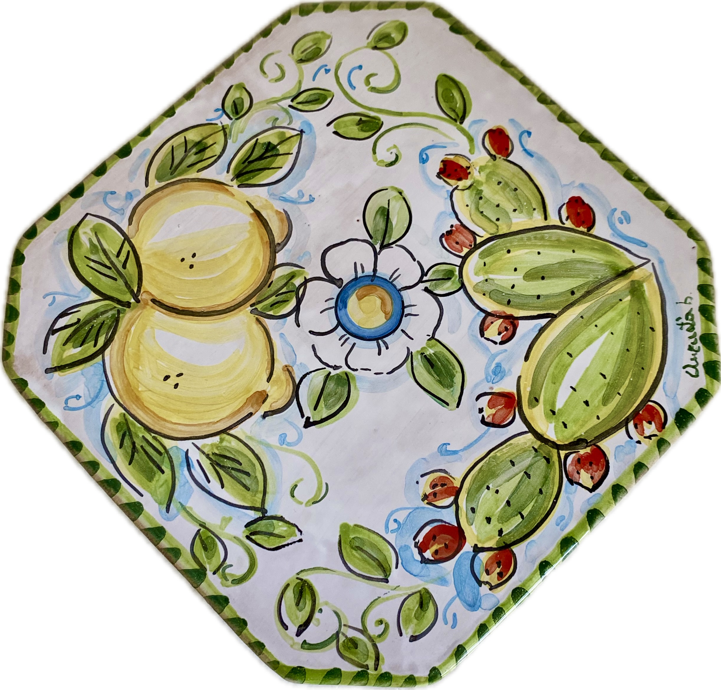Splendido sottopentola ottagonale in ceramica dipinto a mano, con un elegante fiore centrale e dettagli colorati che raffigurano limoni e fichi d’India sui lati. Realizzato con cura artigianale, è perfetto per proteggere le superfici dal calore e aggiungere un tocco di colore e tradizione alla tua cucina.