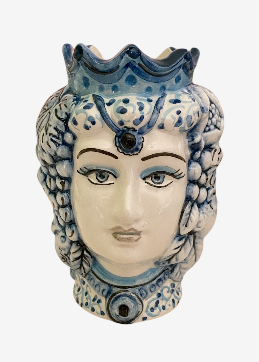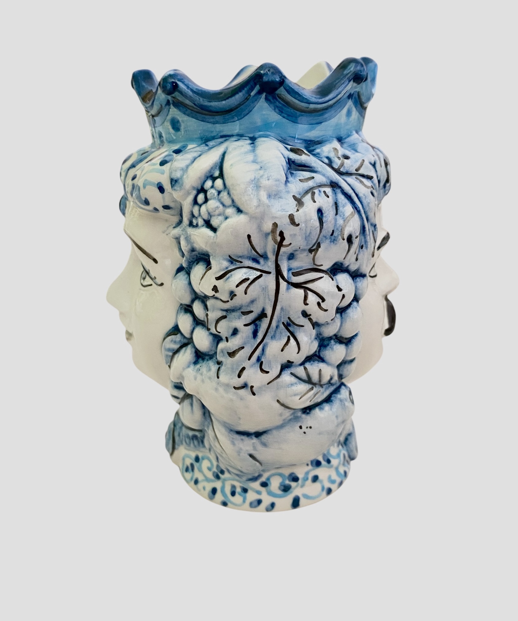 Porta l’eleganza e la tradizione siciliana nella tua casa con questa raffinata Testa di Moro bifacciale, realizzata e dipinta a mano.
